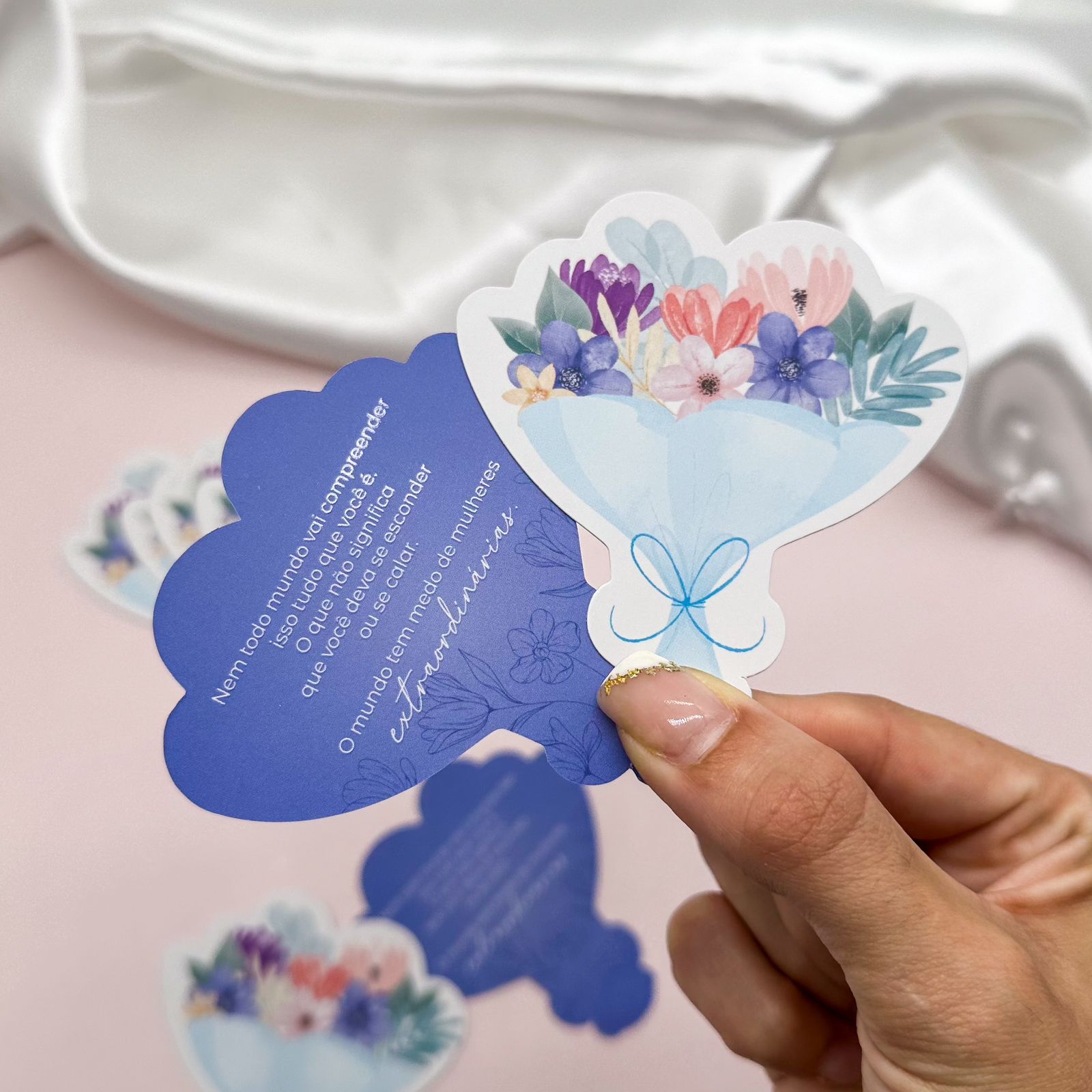 Impressão e Acabamento: Impressão Colorida Frente e Verso. Acabamento em Laminação Fosca Frente e Verso + Verniz Localizado Verso com | Corte em Formato de Buquê