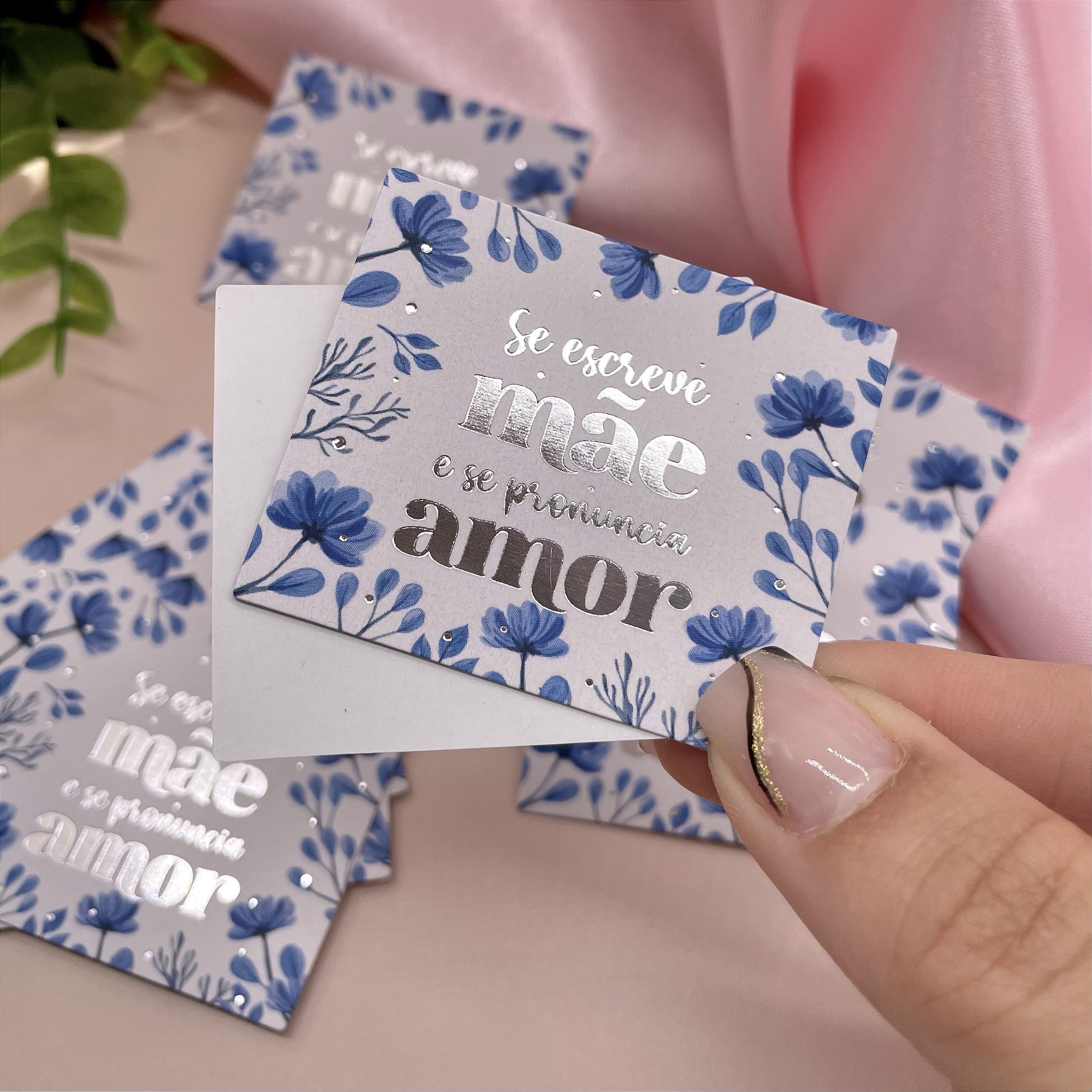 Impressão e Acabamento: Impressão Colorida apenas frente (verso na cor branca) com acabamento em Laminação Fosca + Hotstamping Prata apenas frente.
